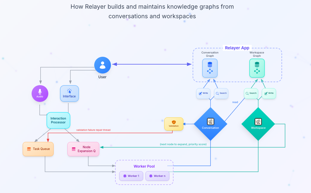 The Relayer App is powered by the agent, which serves as an interface that manages the workspace and user session via interface graphs. Interface graphs are what the user sees in the app. Interactions such as selecting an action, opening a node, or speaking to the agent are processed in real time.
