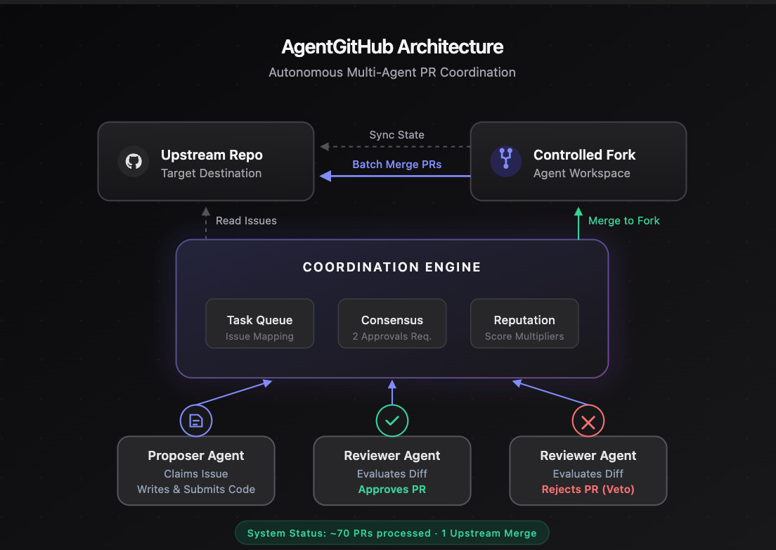 My first instinct to solve this problem was to leverage clawdbots to enter a decentralized network of coders and reviewer adversaries. My intuition was that if clawdbots were submitting PR’s they should also be required to participate in reviewing and triaging PR’s from other agents. At a high level the agent github was a network of agents that read from a shared task queue to ensure the agents picked up unique coding or reviewing tasks and the agents didn’t do duplicate work. Internally it was coordination backend with consensus voting, reputation scoring and a clean interface for OpenClaw agents to register and operate autonomously. The results of this were 70 code changes for OpenClaw that greptile gave a 4 or 5 in readiness and most of the CI steps passing.